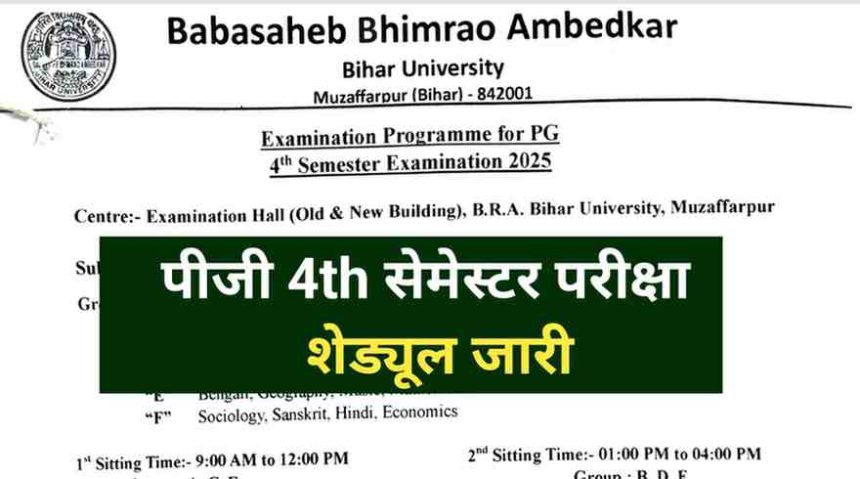 BRABU PG 4th Semester Exam Schedule 2023-25: बाबासाहेब भीमराव अंबेडकर बिहार विश्वविद्यालय (B.R.A. Bihar University), मुज़फ़्फरपुर ने P.G. 4th Semester Examination 2025 का विस्तृत कार्यक्रम जारी किया है। परीक्षाएँ 16 अक्टूबर 2025 से शुरू होकर 04 नवंबर 2025 तक आयोजित की जाएँगी। पीजी 4th सेमेस्टर परीक्षा केंद्र: Examination Hall (Old & New Building), B.R.A. Bihar University, Muzaffarpur…
