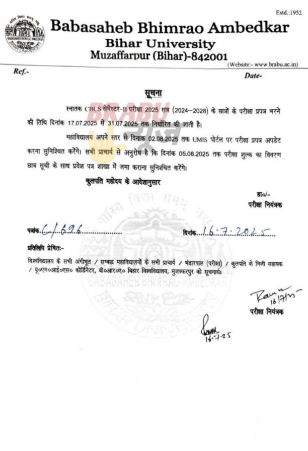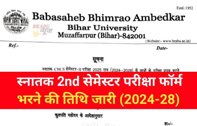 BRABU UG 2nd Semester Exam Form Date 2024-28: बाबासाहेब भीमराव अम्बेडकर बिहार विश्वविद्यालय, मुजफ्फरपुर (Babasaheb Bhimrao Ambedkar Bihar University – BRABU) में स्नातक सत्र 2024-28 सेकंड सेमेस्टर का परीक्षा फॉर्म गुरूवार यानी 17 जुलाई से भरा जाएगा इसको लेकर बिहार विश्विद्यालय के तरफ से नोटिस जारी की गयी है