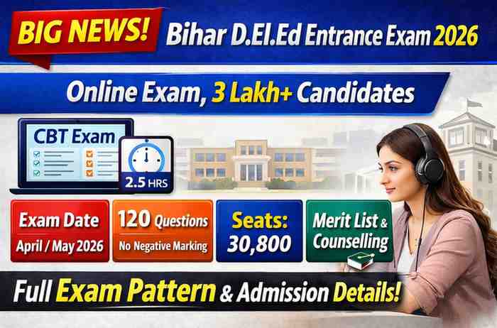 Bihar D.El.Ed Entrance Exam 2026 Bihar: Full Details, Online Exam, Seats & Reservation Info: बिहार विद्यालय परीक्षा समिति (BSEB) द्वारा आयोजित होने वाली डीएलएड (D.El.Ed) संयुक्त प्रवेश परीक्षा 2026 को लेकर बड़ी अपडेट सामने आई है। इस बार परीक्षा का आयोजन अप्रैल 2026 के अंतिम सप्ताह या मई 2026 के पहले सप्ताह में किया जाएगा। इस परीक्षा में 3,08,560 अभ्यर्थियों ने आवेदन किया है, जो पिछले वर्षों की तुलना में अधिक है। इससे यह स्पष्ट है कि डीएलएड कोर्स के प्रति छात्रों का रुझान लगातार बढ़ रहा है।