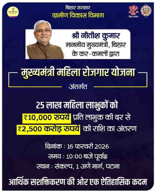 Mukhyamantri Mahila Rojgar Yojana Payment Status Check Online 2026 – ₹10,000 Released:बिहार की महिलाओं के लिए 16 फरवरी 2026 का दिन ऐतिहासिक साबित हुआ। मुख्यमंत्री नीतीश कुमार ने पटना स्थित संकल्प भवन, 1 अणे मार्ग से सरकार की ओर से मुख्यमंत्री महिला रोजगार योजना के तहत 25 लाख महिलाओं के बैंक खातों में ₹10,000/- की पहली किस्त डीबीटी (DBT) के माध्यम से जारी कर दी।