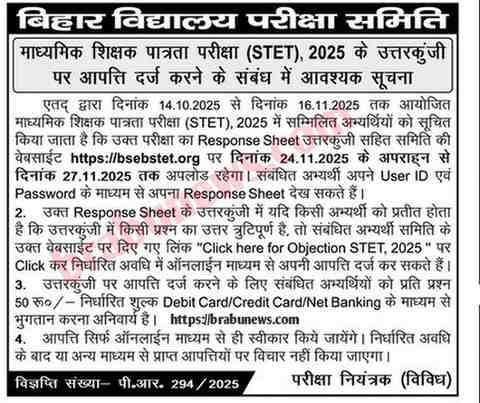 समिति द्वारा जारी सूचना के अनुसार, 14 अक्टूबर 2025 से 16 नवंबर 2025 तक आयोजित STET परीक्षा का Response Sheet (उत्तरसूची) सहित Answer Key वेबसाइट https://bsebstet.org पर 24 नवंबर 2025 के अपराह्न (Afternoon) से उपलब्ध कर दिया गया है।