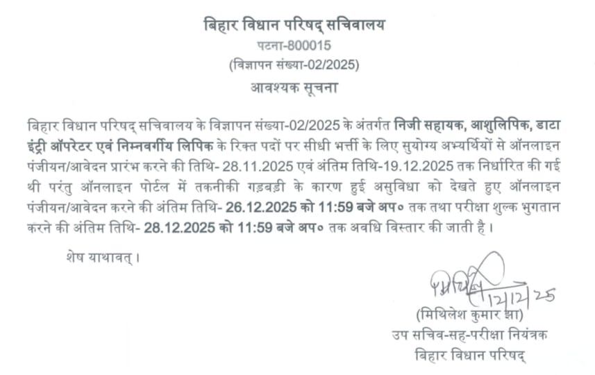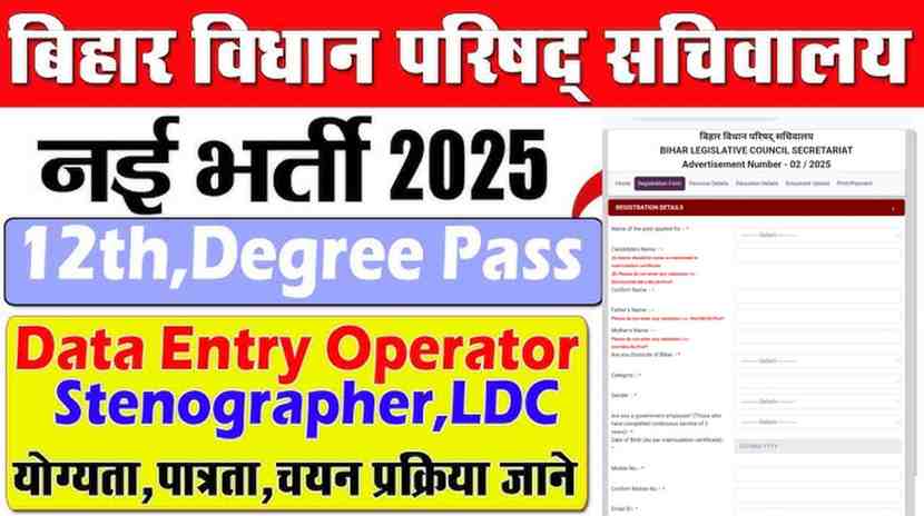 Bihar Vidhan Parishad Recruitment 2025 Online Form Update: बिहार विधान परिषद सचिवालय, पटना द्वारा विज्ञापन संख्या 02/2025 के अंतर्गत विभिन्न पदों पर सीधी भर्ती के लिए आधिकारिक अधिसूचना जारी की गई है। इस भर्ती के माध्यम से निजी सहायक, आशुलिपिक, डाटा एंट्री ऑपरेटर एवं निम्नवर्गीय लिपिक के कुल 64 पदों पर नियुक्ति की जाएगी।