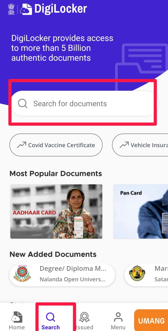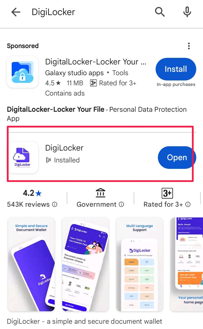 - यहां पर आपको सर्च बॉक्स मे Digilocker App को टाईप करना होगा औऱ सर्च करना होगा,
