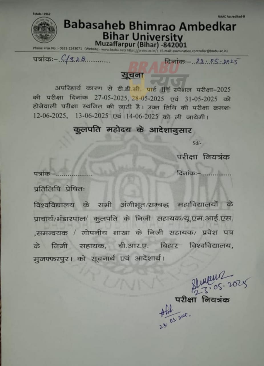 आपको बता दें कि बिहार विश्वविद्यालय ने पहले 16 मई 2025 से होने वाली थी परीक्षा लेकिन कुलपति के आदेशानुसार BRABU TDC Part-II Special Examination-2025 प्रारंभ होने से पहले स्थगित कर दिया था