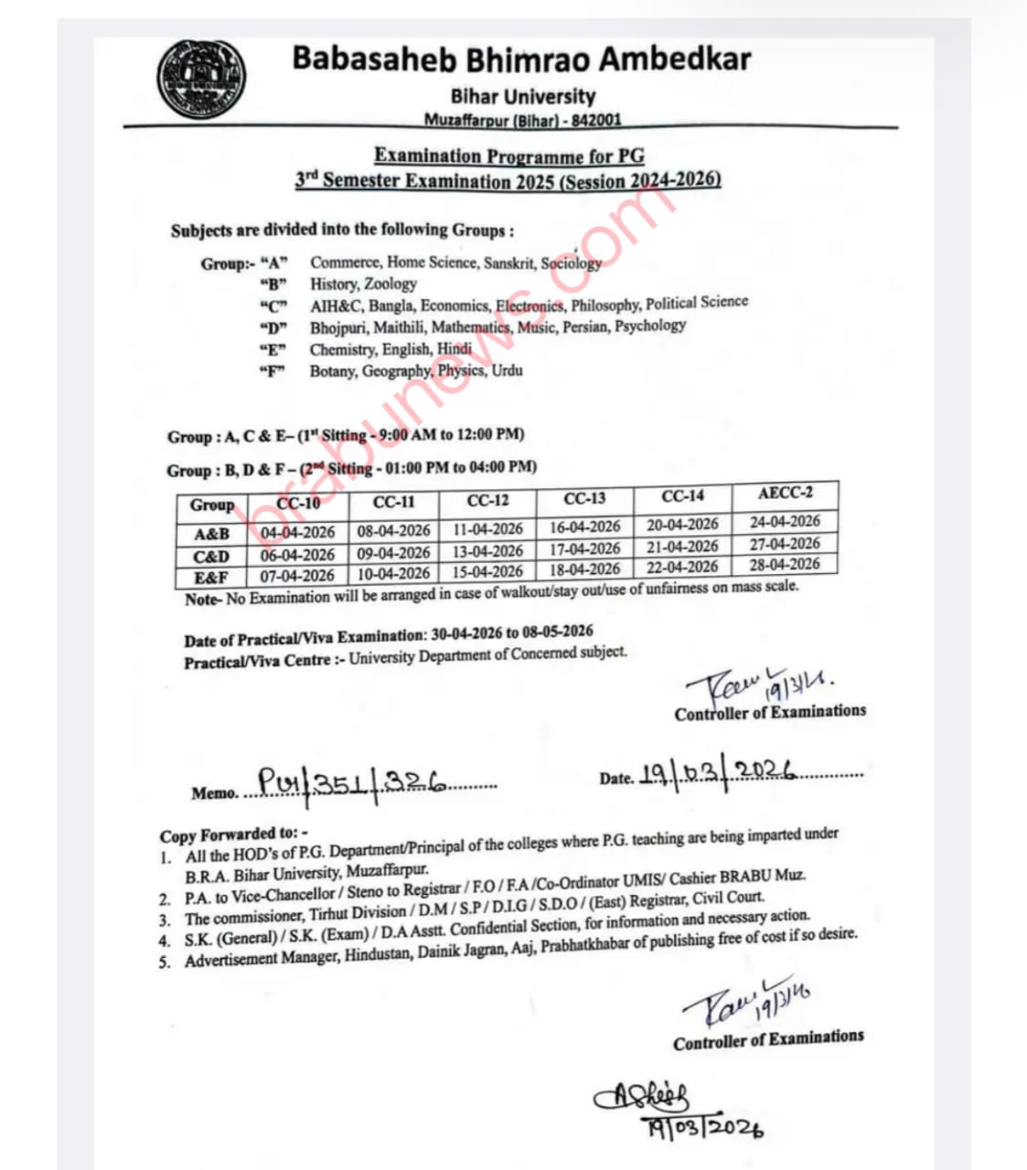 BRABU PG 3rd Semester Exam Schedule 2025: Full Routine Released: Babasaheb Bhimrao Ambedkar Bihar University (BRABU) ने PG (Post Graduate) सत्र 2024-2026 के 3rd Semester Examination 2025 का विस्तृत परीक्षा कार्यक्रम जारी कर दिया है।