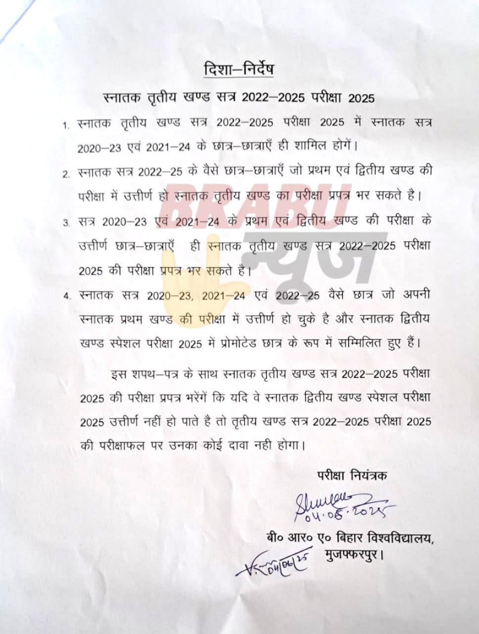 बीआरए बिहार विश्वविद्यालय के परीक्षा नियंत्रक डॉ. सुबा लाल पासवान (BRABU Controller of Examinations, Dr. Suba Lal Paswan) ने बुधवार को परीक्षा फॉर्म भरने के लिए गाइडलाइन जारी की। स्नातक पार्ट-3 का परीक्षा फॉर्म 06 जून 2025 तक बिना विलंब शुल्क के फॉर्म भरा जायेगा. इसके बाद 09 जून 2025 से 200 रुपये विलंब शुल्क के साथ 13 जून 2025 तक विद्यार्थी भर सकते हैं।