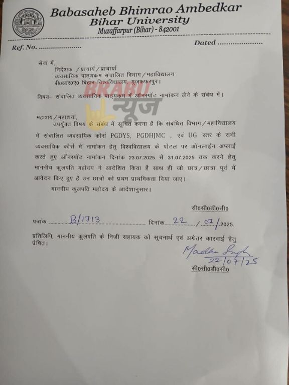 बिहार विश्विद्यालय संबंधित विभाग / कॉलेज में संचालित वोकेशनल कोर्स PGDYS, PGDHJMC एवं UG स्तर के सभी व्यवसायिक कोर्स में नामांकन हेतु विश्वविद्यालय के पोटल पर नया Online Apply करते हुए ऑनस्पॉट नामांकन दिनांक 23 July 2025 से 31 July 2025 तक करने हेतु माननीय कुलपति महोदय ने आदेशित किया है साथ ही जो छात्र/छात्रा पूर्व में आवेदन किए हुए है उन छात्रों को प्रथम प्राथमिकता दिया जाए।