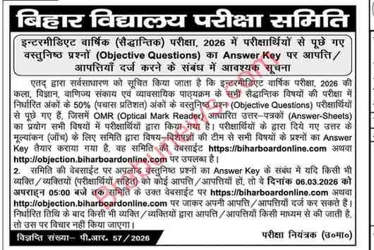 BSEB Class 12 Exam 2026: Objective Answer Key Published, Students Can Raise Objections Online: बिहार विद्यालय परीक्षा समिति (BSEB) ने इंटरमीडिएट वार्षिक (सैद्धांतिक) परीक्षा 2026 में पूछे गए वस्तुनिष्ठ (Objective) प्रश्नों की आधिकारिक Answer Key जारी कर दी है। समिति द्वारा जारी सूचना (विज्ञप्ति संख्या – पी.आर. 57/2026) के अनुसार, परीक्षार्थी निर्धारित तिथि के भीतर ऑनलाइन माध्यम से Answer Key पर आपत्ति दर्ज कर सकते हैं।
