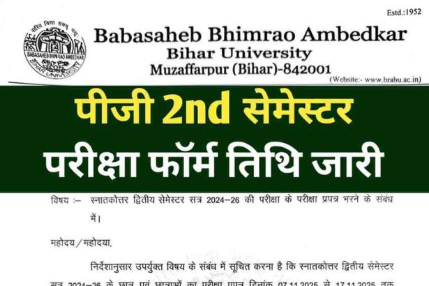 BRABU Notification 2025: PG 2nd Semester (2024–26) Exam Form Fill Up Date Announced: बाबासाहेब भीमराव अंबेडकर बिहार विश्वविद्यालय (BRABU), मुजफ्फरपुर ने स्नातकोत्तर (PG) द्वितीय सेमेस्टर सत्र 2024–26 के विद्यार्थियों…