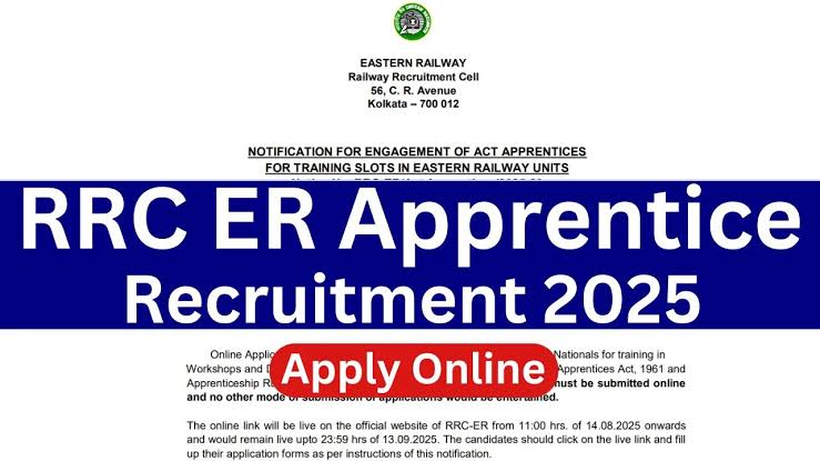 Railway RRC ER Apprentice Recruitment 2025: रेलवे रिक्रूटमेंट सेल (RRC) ने ईस्टर्न रेलवे की यूनिटों के लिए 3000 से अधिक अप्रेंटिस की वैकेंसी निकाली हैं। इच्छुक एवं योग्य उम्मीदवार RRC की आधिकारिक वेबसाइट rrcer.org पर जाकर 14 अगस्त से 13 सितंबर 2025 तक ऑनलाइन अप्लाई कर सकते हैं इसे भी पढ़े-बिहार की वोटर लिस्ट का पहला ड्राफ्ट…